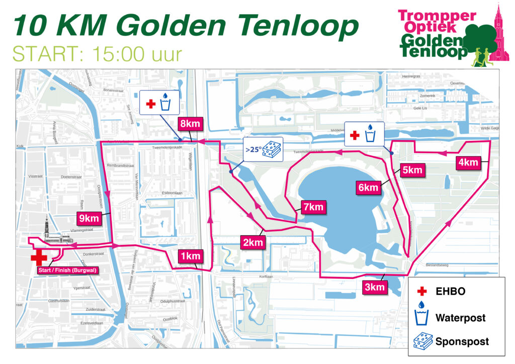 De 10 km is het hoofdonderdeel en de klassieker van de Golden Tenloop. Deze afstand combineert het bruisende centrum van Delft met het groen van het Delftse Hout, wat zorgt voor een afwisselend en aantrekkelijk parcours.